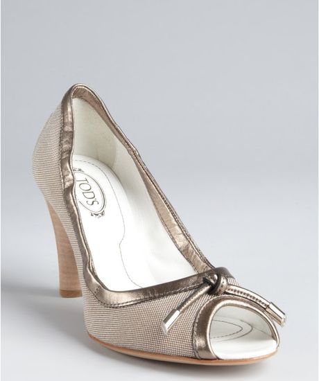 Adorn hand-painted grey two-tone leather sling-back pump with leather rosettes and leather-covered heel; heels sport retro flair. peep-toe pump with a leather flower embellishment; ... View Full Source